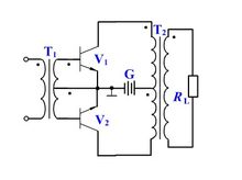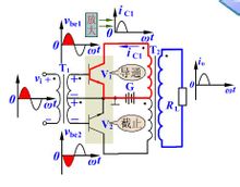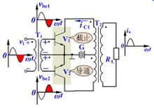 当正向电压到来时,V1导通,V2截止,经V1放大后输出;当负向电压到来时,V2导通,V1截止,经放大后输出。最后都经T2变压后输出。